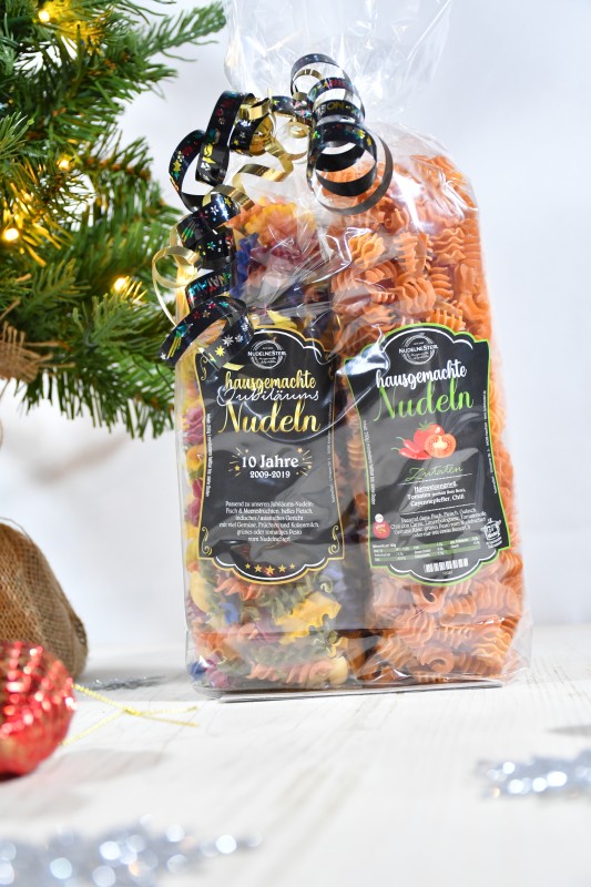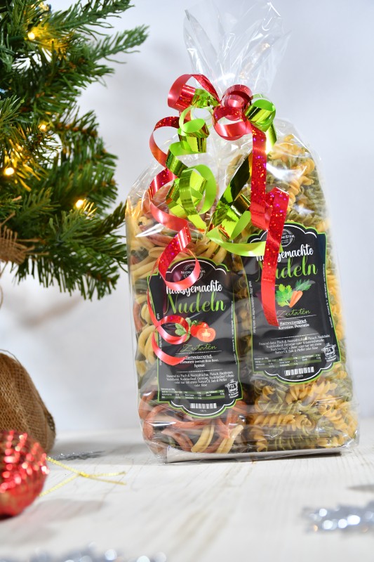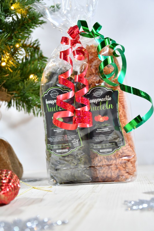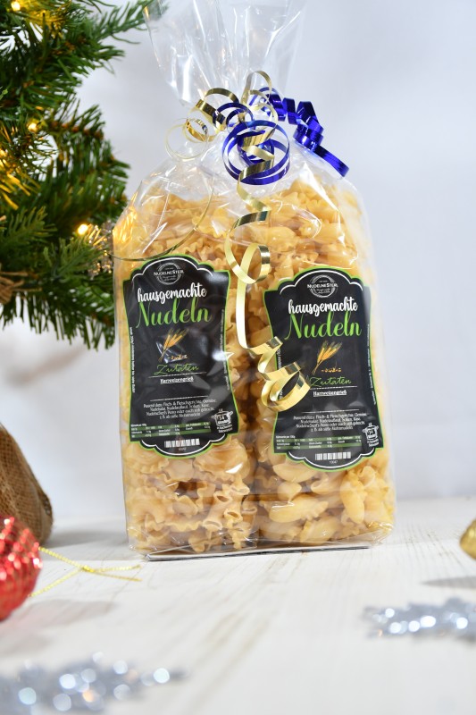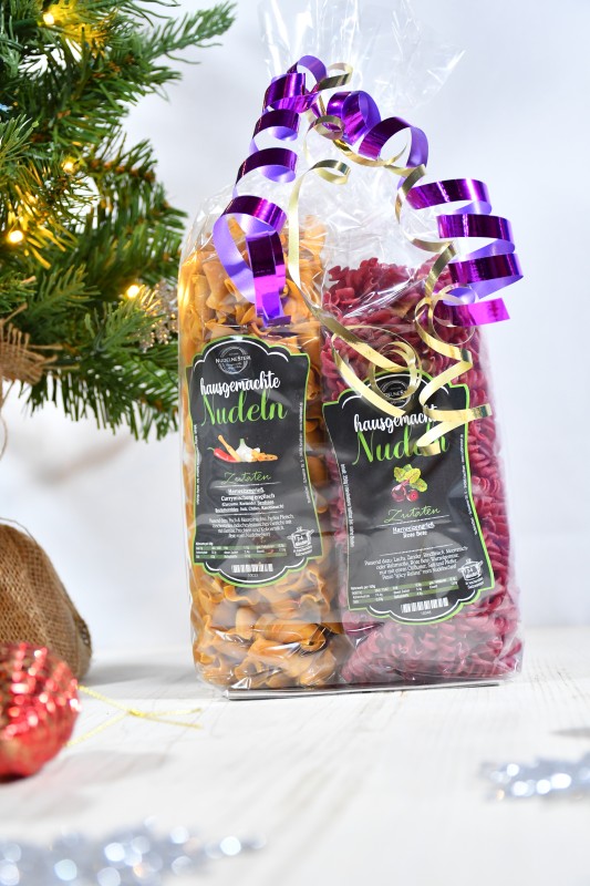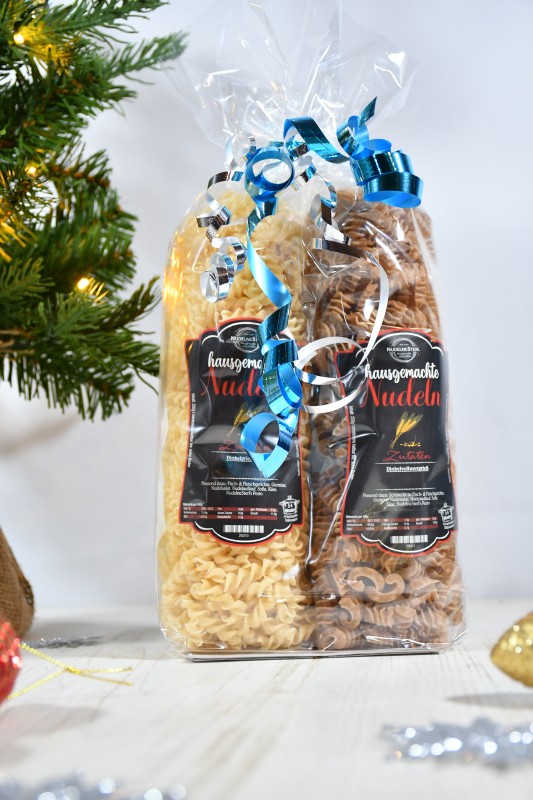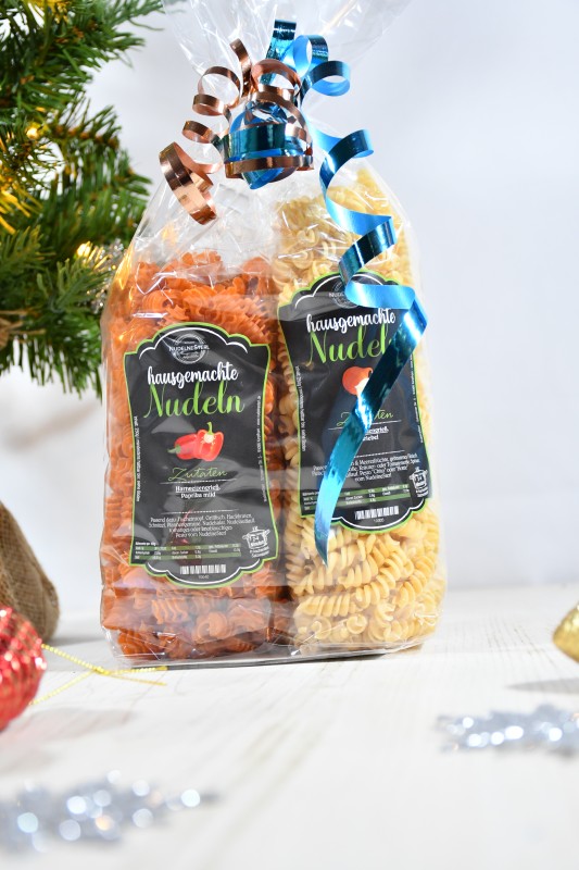 Die Packungen sind je 2 Sorten unserer hausgemachten Nudeln.