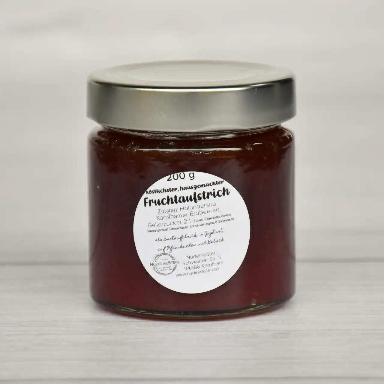 - Zutaten: Holundersud (Holunderblüten von der eigenen Staude, Wasser), Karpfhamer Erdbeeren, Gelierzucker 2:1 (Zucker, Geliermittel Pektine, Säuerungsmittel Citronensäure, Konservierungsstoff Sorbinsäure)